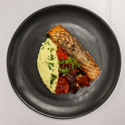 Lemon peppered salmon, mixed salad leaves, cucumber, olives, capers, mixed cherry tomat...