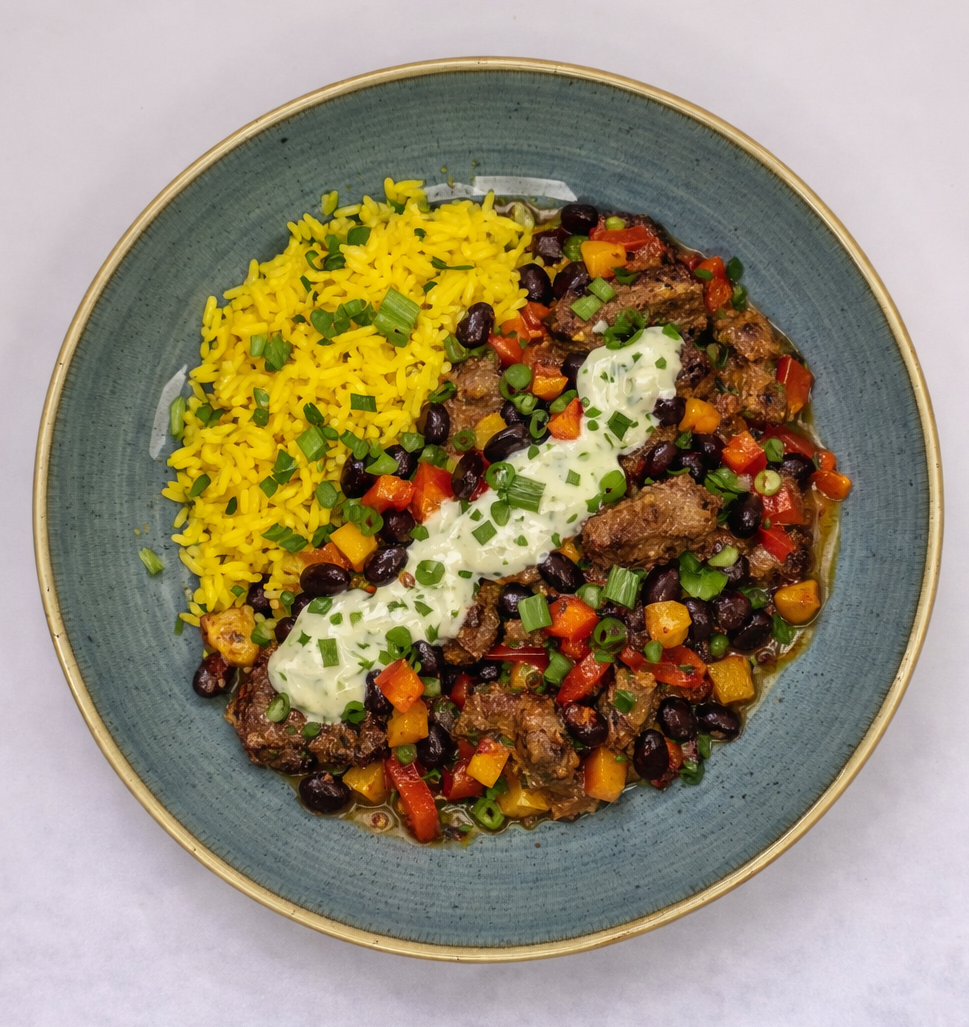 Caribbean-spiced beef, black beans. Served with pilau rice and a coconut-lime & jalapeñ...